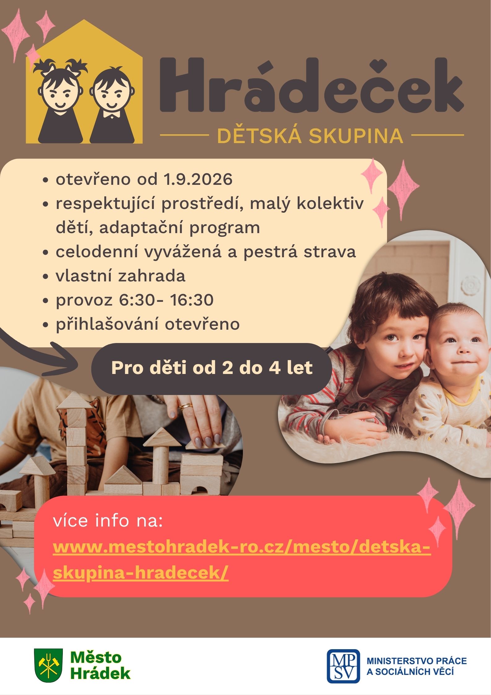 Pod složkou Město - dětská skupina Hrádeček byly zveřejněny informace o zřízení dětské skupiny Hrádeček, odkaz:/mesto/detska-skupina-hradecek/