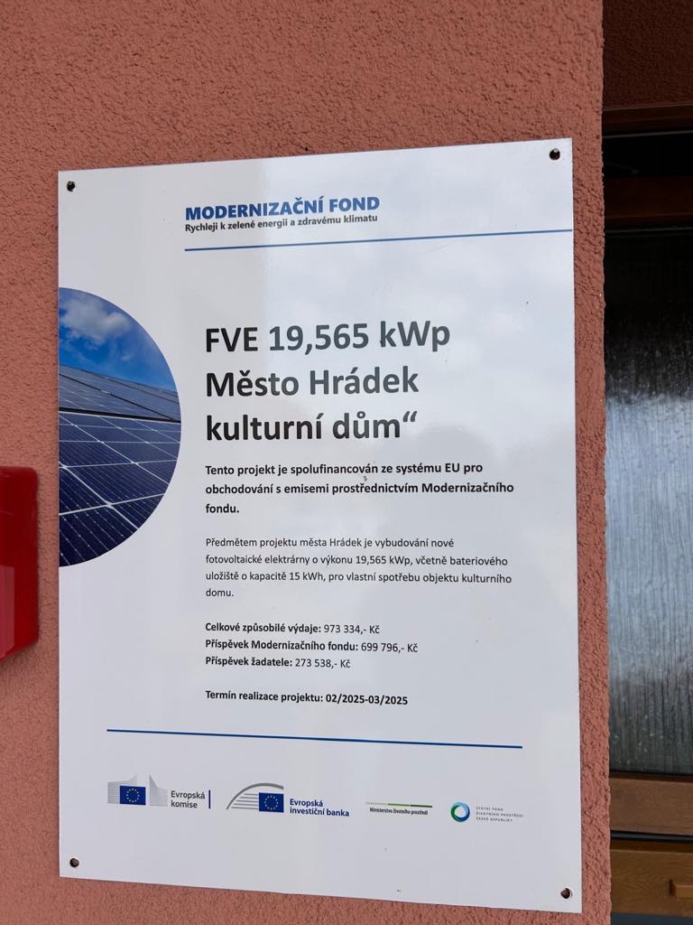 Předmětem projektu města Hrádek je vybudování nové fotovoltaické elektrárny o výkonu 19,565 kWp, včetně bateriového uložiště o kapacitě 15 kWh, pro vlastní spotřebu objektu kulturního domu.